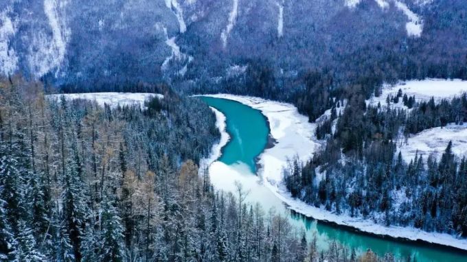 今日啟程,離開酒店后出發前往【喀納斯景區】冬日的喀納斯便是眾神沉睡的仙境。這里的一切仿佛被施了魔法,靜謐、空靈,美得不染塵埃。當西伯利亞的寒流南下,喀納斯便進入了長達六個月的冬眠。往日奔騰的喀納斯河與湖水緩緩凝固,化為巨大的、白玉般的冰面。山川 、湖泊、森林、村莊,全部被厚厚的白雪覆蓋,萬物輪廓變得柔和,仿佛天地間只剩下了黑、白 、藍三種最純粹的色彩, 神仙灣、月亮灣 、臥龍灣,這些在旺季里游人如織的景點,在冬日里顯得格外空靈。月亮灣那著名的 “ 腳印”被白雪勾勒,更 添神秘。湖畔的樹木掛滿了晶瑩的霧凇,每一根枝條都包裹在潔白的冰晶中, 形成連綿不絕的霧凇長廊。在這片純白的世界里,動物們的足跡成了雪地上的靈動筆觸 。狐貍、雪兔、馬鹿的足跡蜿蜒伸向森林深處,為這片寂靜的王國注入了生命的氣息。